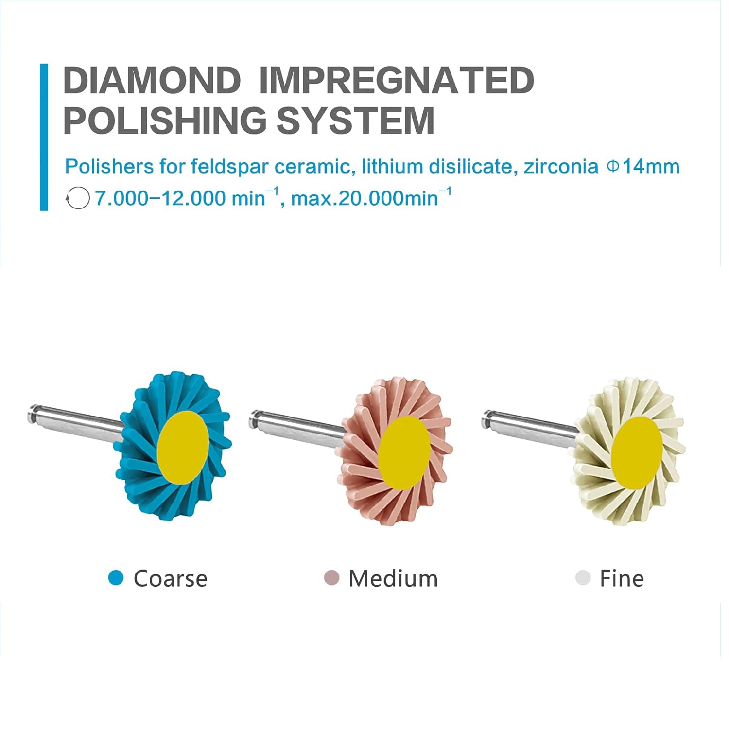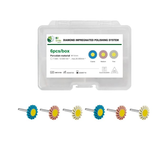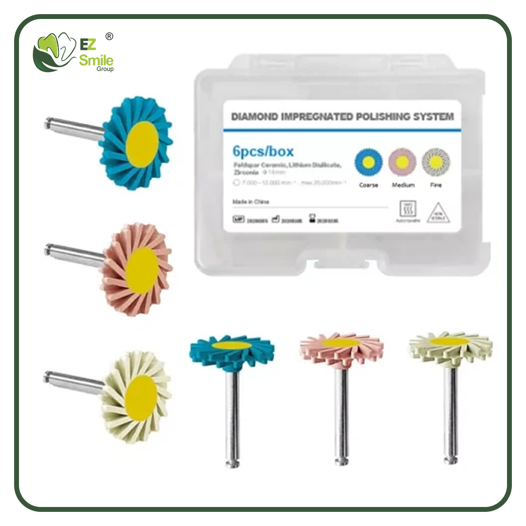 Polish like a pro with the EZ Smile 3-Step Diamond Polishing Kit, designed for superior results on ceramics, composites, and veneers. This all-in-one spiral rubber wheel system uses diamond-infused micro-particles to achieve a smooth, mirror-like glazing effect without the need for additional polishing paste.